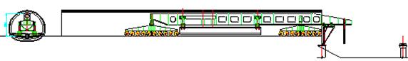 3、操作系統(tǒng)由運(yùn)輸狀態(tài)轉(zhuǎn)換至喂梁狀態(tài),由后車及主支腿驅(qū)動(dòng)裝置推動(dòng)整機(jī)前行,當(dāng)輔助支腿到達(dá)待架孔前方橋墩支承位置時(shí)停車。在箱梁下面放置臨時(shí)支墩,并將箱梁放在臨時(shí)支墩上,然后打好輔助支腿。