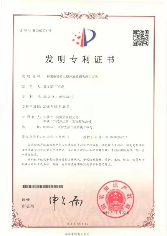 【發(fā)明專利證書】一種架橋機橋上整體旋轉(zhuǎn)調(diào)頭施工方法
